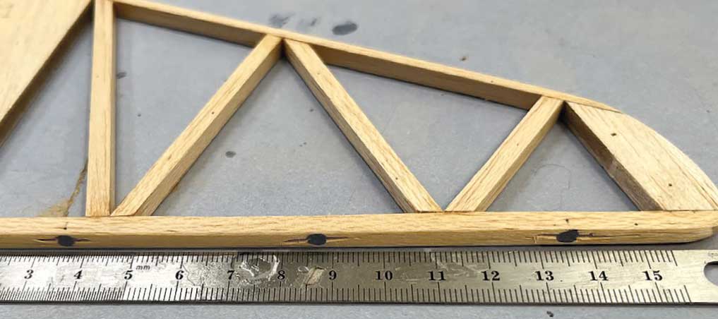 (Author’s Note: The only deviation I made from the wing build instruction was to tack-glue W2 in place to W13 and the bottom spar. I found this made fitting and checking dihedral measurements easier when joining the center and wing panels together. Just remember not to glue the LE to W2 yet, as you will need to fit W3 into place once you’ve set and glued the dihedral [Photo 14].)