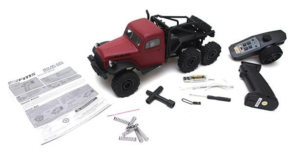>> For pilots who might still be scratching their heads as to why reviews of surface models are now appearing in a magazine hitherto reserved for air-based models, a recent bit of news that first dropped in the 2020 Fall issue is that Park Pilot insurance now covers surface vehicles too! In a somewhat equally disorienting turn of events, FMS Model, a company long known for designing and manufacturing a rich variety of foam-based electric aircraft models, surprisingly enough released several surface vehicles in 2020. This review takes a close look at the second surface model released by this veteran player in the RC model airplane industry, the 1/18-scale Atlas 6x6 Ready to Run crawler. There are two color schemes from which to choose. It arrives packaged in a two-piece, rigid foam, clamshell case that will assuredly be used by most drivers as a storage and transport case. As a Ready to Run model, the only items not included in the box (but required to get this truck out on the trail) are four AAA dry cells for the transmitter. Speaking of the transmitter, the Atlas comes equipped with a unique, two-channel 2.4 GHz pistol-grip radio transmitter that can be broken down into two pieces. This allows it to be packed into a much smaller space than the almost ubiquitous and somewhat unwieldy one-piece pistol-grip transmitters. Items that come with the Atlas include a set of six firmer springs, a lug wrench to remove the tires, a small screwdriver, a USB-style charger, a bind plug, and a single sheet of instructions (also available online). The included large instruction sheet features English on one side and what appears to be Chinese on the other side. The instructions cover all of the necessary basics, including binding instructions, radio transmitter trim, channel reversing information, and the charging and installation of the two-cell LiPo battery. A six-pack of exploded-view drawings is also included. These extremely detailed drawings should allow drivers to easily disassemble and reassemble their Atlas should any repairs become necessary. A spare parts matrix, complete with part numbers, rounds out the provided documentation. This small, scale crawler is packed with some big truck features! I really liked the look of the beadlock-style rubber tires, the use of ring and pinion axles, the aluminum ladder-style frame rails, and the cool-looking and impressively bright LED headlights and taillights.